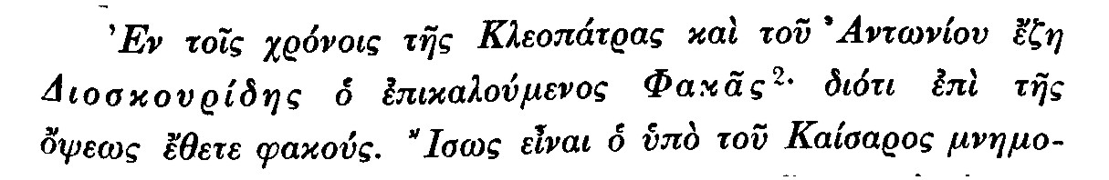 που υποδηλώνει ότι ο Διοσκουρίδης (ή Διοσκορίδης) ο Πεδάνιος που έζησε από 40-90 μΧ χρησιμοποιούσε κάποιας μορφής φακούς όρασης (ή έτρωγε πολλές φακές;). Δεν υπάρχουν όμως άλλα στοιχεί που να επιβεβαιώνουν κάτι τέτοιο.