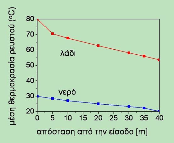 Διάγραμμα μεταβολής της μέσης θερμοκρασίας με την απόσταση από την είσοδο των δύο ρευστών.
