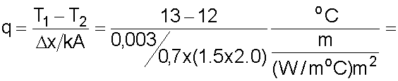Να υπολογιστούν οι απώλειες θερμότητας από ένα τζάμι διαστάσεων 1.5x2x0.003 m εάν η θερμική του αγωγιμότητα είναι 0.7 W/moC και η θερμοκρασία στις δύο πλευρές του είναι 12oC και 13oC αντίστοιχα.