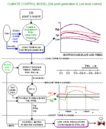 Therefore the growers' intuition and experience is allowed to intervene at different stages, and user goals can be expressed at different levels of management, from rules about quality and yield, down to set-point manipulation (figure 3). The remote controller unit (RCU) handles all of the closed loop controls for the greenhouse operation, such as heating or ventilator degree setting, mist operation, valve setting for irrigation and nutrient supply, etc. All RCU functions are parametric and can autonomously do scheduling of operations, take energy saving measures etc, in the framework of short to medium term planning. Higher level decisions, made at the central station, are concerned with long and medium term strategies and operator's goals, and are passed down to the RCU as parameters of reference generating functions for real time set-point derivation.
