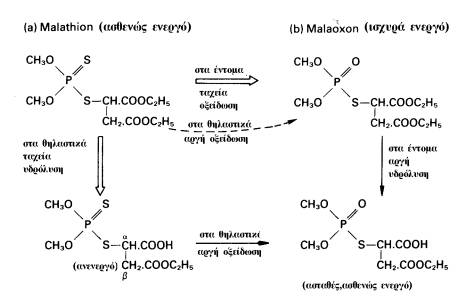 εντόμων και θηλαστικών είναι ότι η οξείδωση του malathion γίνεται πολύ πιο